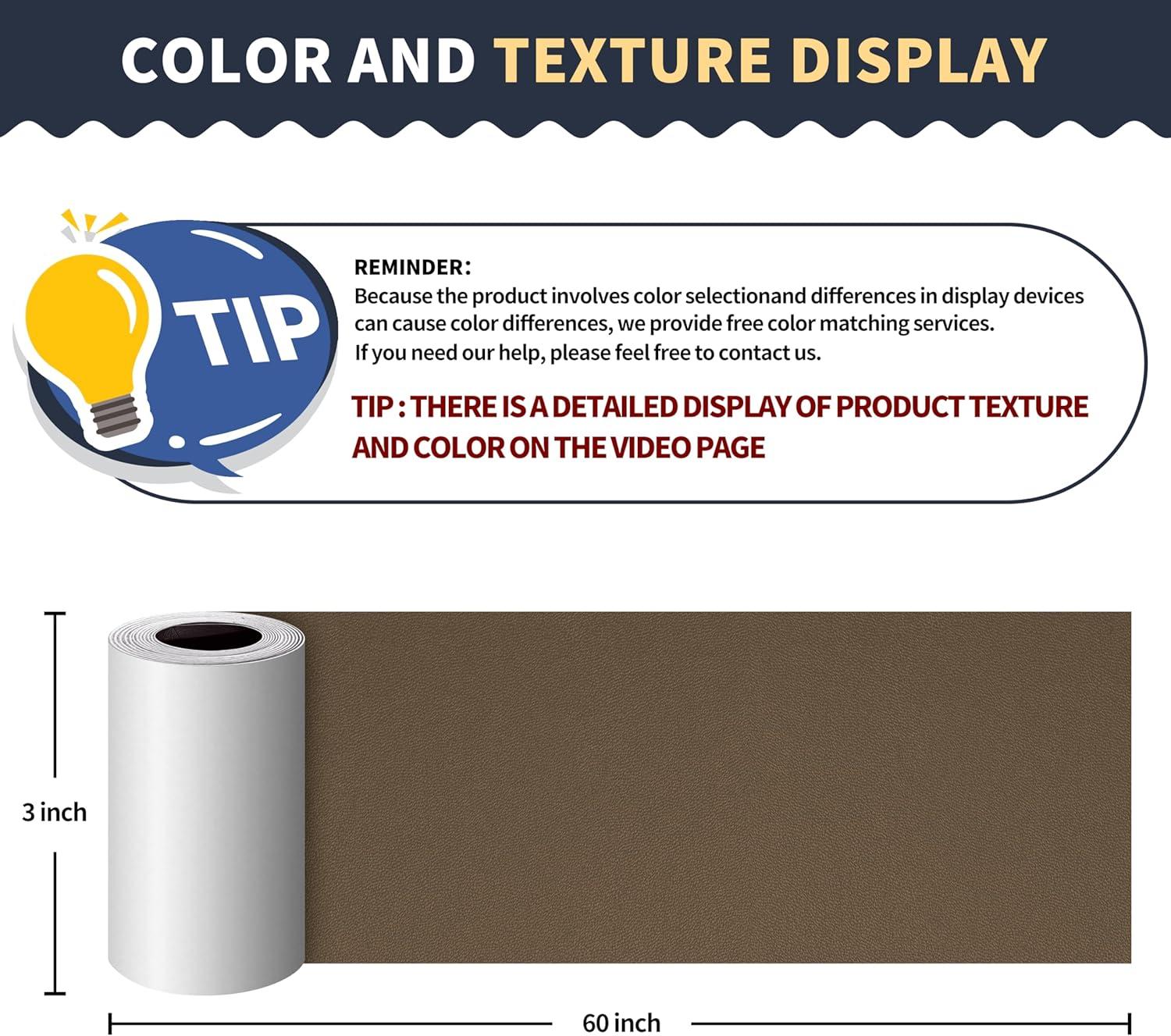 Classic Size: 3 x 60 inches leather repair tape, you can cut any size as needed. Leather texture is soft and smooth, medium thickness, good repair leather repair tape.